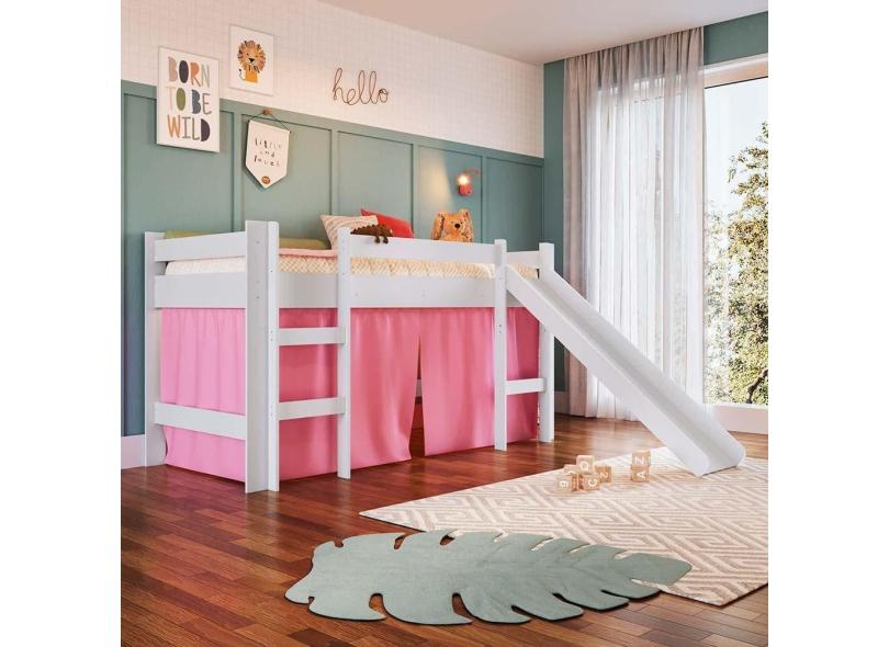 Cama Infantojuvenil Elevada com Escorrega e Cortina Completa Móveis Branco/rosa