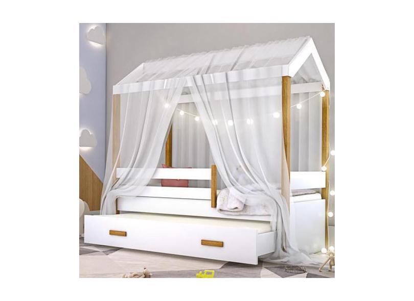 Cama Montessori com Auxiliar Bola LED Colchão e Dossel Branco - Mais d