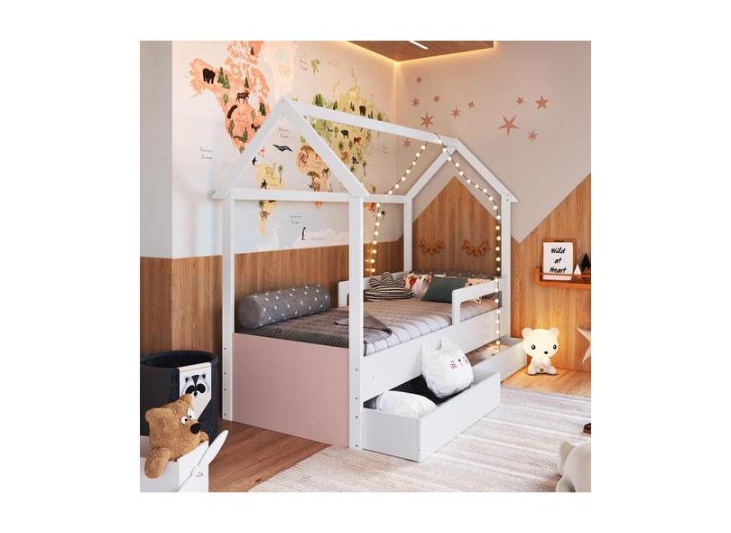 Cama Montessori Infantil tipo Cabana com 2 Gavetas Branco Rosa - Compl