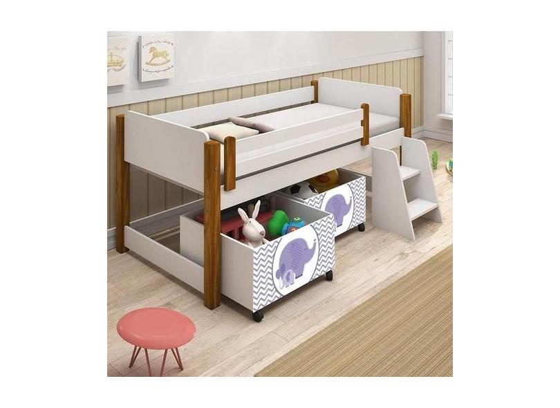 Cama Naty Branco/Mel com 2 nichos adesivadas filhote lilas e escadinha