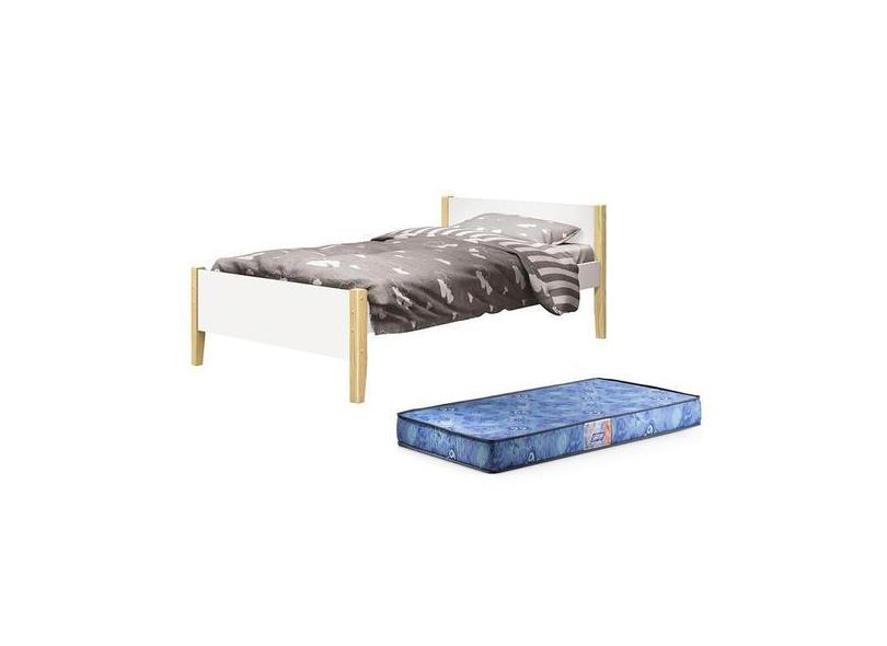 Cama Solteiro Simba Branco Fosco Com Pés Madeira Natural E Colchão D20
