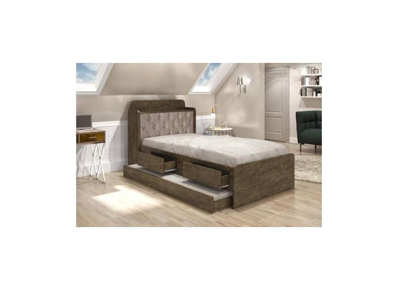 Cama Tamires Baú Castanho com Capitonê Bege e Auxiliar