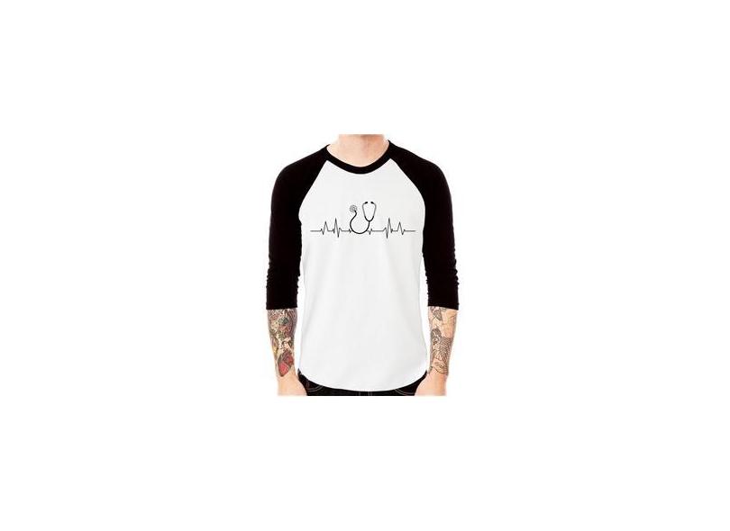 Camiseta Raglan Batimentos Cardíacos Estetoscópio Medicina Manga 3/4