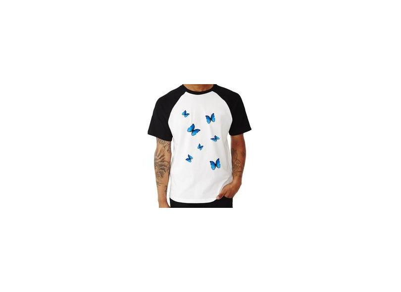 Camiseta Raglan Borboletas Azuis - Foca Na Moda