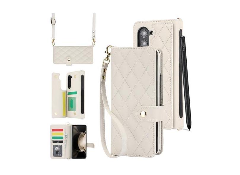 Capa de couro crossbody com slot para caneta para Samsung Galaxy Z Fold 5 4 Fold5 Fold4 Fold3 Alça de pulso Capa carteira para cartão, branca, para Galaxy Z Fold4