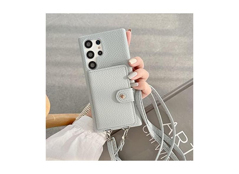 O menor preço encontrado no Brasil para Capa de telefone com alça de ombro de couro de lichia da moda para Samsung S23 Ultra S20 S21 S22 Note 8 9 10 20 Capa carteira crossbody, azul, S20 Plus atualmente é R$ 422,16.