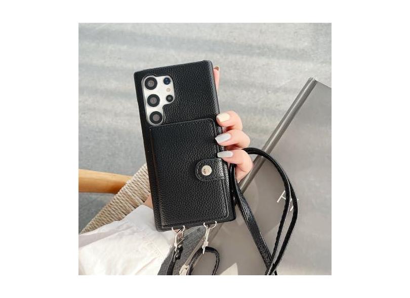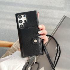 Capa de telefone com alça de ombro de couro de lichia da moda para Samsung S23 Ultra S20 S21 S22 Note 8 9 10 20 Capa carteira crossbody, preta, S21 Plus