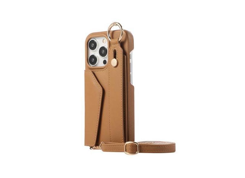 Capa de telefone de couro com alça de pulso crossbody para IPhone 15 14 Plus 13 Mini 12 11 Pro Max Carteira com capa de suporte para cartão, marrom, para IPhone 14 Pro Max