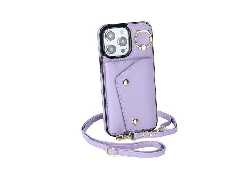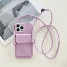 Capa tipo carteira com alça de ombro para iPhone 15 Pro Max 14 13 12 11 Pro Max 15 Plus 13 Pro Lady Couro Bolso para cartão Cordão Capa, Roxo, Para iPhone 15