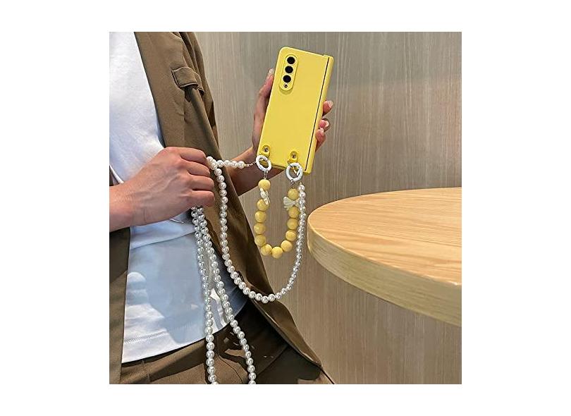 Corrente de pérola longa crossbody portátil com contas de arco pulseira capa de telefone para Samsung Galaxy Z Fold 4 3 5G Z Fold 5 capa protetora, amarela, para Z Fold 3