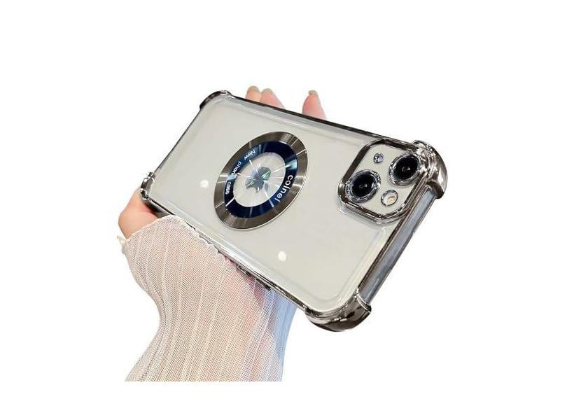 Eiyikof Capa magnética transparente para iPhone 15, luxuosa, brilhante, quatro cantos, à prova de choque, proteção de nível militar com protetor de lente de câmera MagSafe capa transparente para