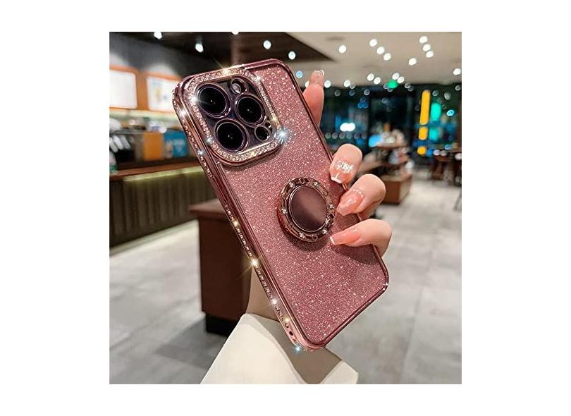 Estojo de suporte de anel de diamante com brilho e strass para iPhone 11 12 13 14 Pro Max XS XR 8 7 Plus SE Capa de silicone macio, ouro rosa, para iPhone 13