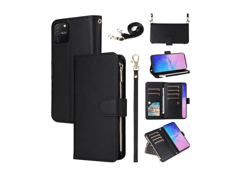 Furill Capa carteira para Samsung Galaxy S10 Lite com alça de pulso destacável, alça de ombro transversal, bolsa de couro com zíper, 11 + compartimentos para cartões, capa protetora para celular