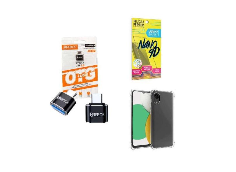 Kit Adaptador USB para Tipo C + Capinha Samsung A03 Core + Película 9D