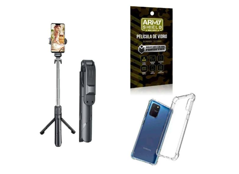O menor preço encontrado no Brasil para Kit Tripé De Selfie + Capinha Samsung S10 Lite + Película 3D atualmente é R$ 64,17.
