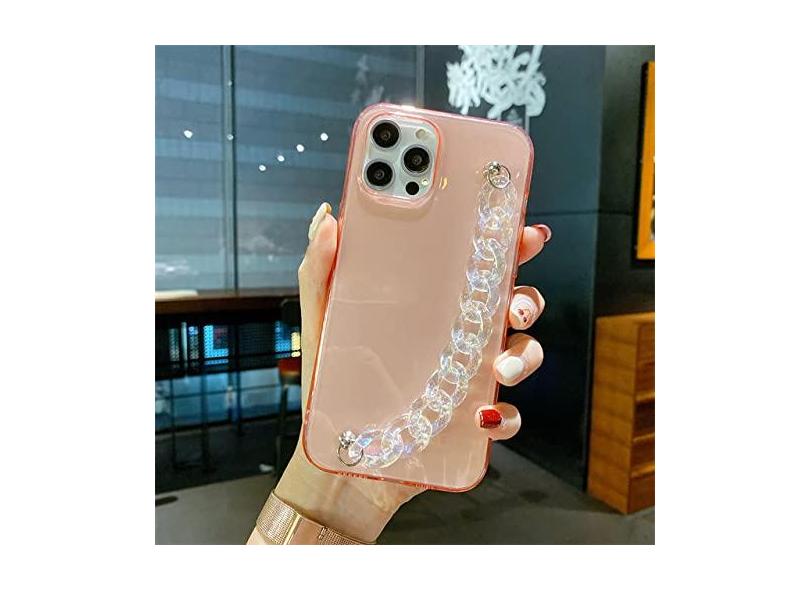 Pulseira de pulso cristal transparente de luxo com corrente para iPhone 11 13 14 Pro XR Xs Max 12mini SE2 6 7 8 Plus Capa de silicone macio, rosa, para iPhone 13 Pro