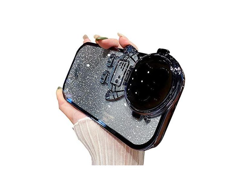 QoKcoahn Capa de telefone com suporte oculto de astronauta para iPhone 14, linda lente de astronauta protetor de câmera com suporte luxuoso com glitter 6D galvanizado transparente protetor de TPU macio para homens e mulheres preto