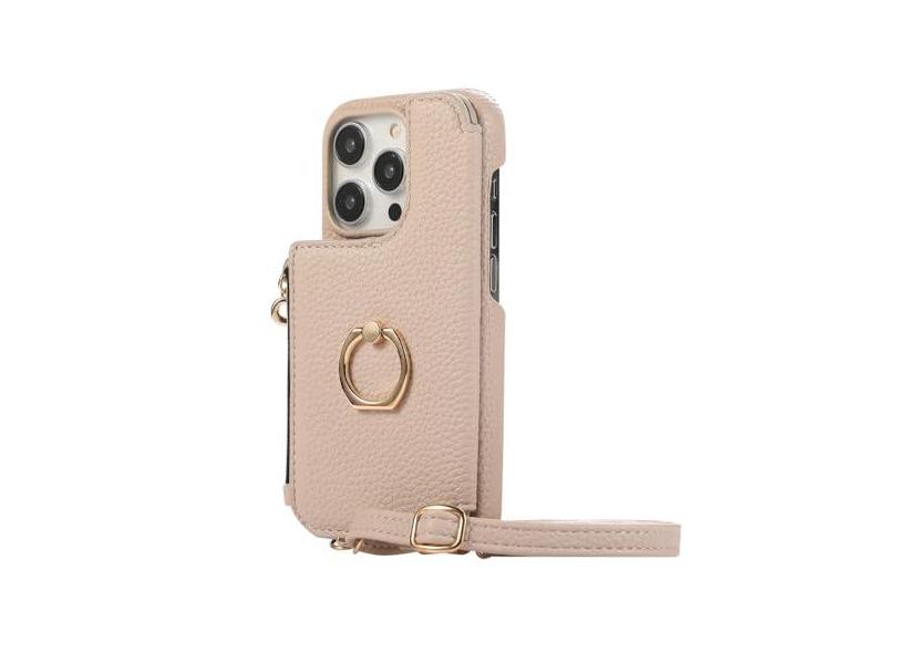 Suporte de anel crossbody com zíper cartões Solt carteira de couro capa para iPhone 15 Pro Max 14 Plus 13 12 11 SE 2022 capa espelhada, cáqui, para iPhone 15ProMax