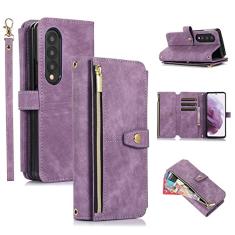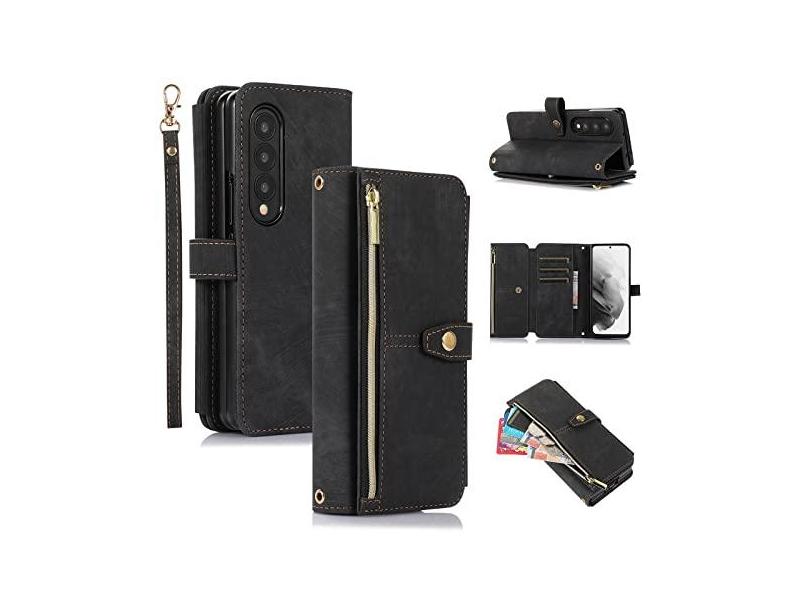 UEEBAI Capa para Samsung Galaxy Z Fold 4 5G, 9 compartimentos para cartões, carteira de couro retrô à prova de choque, capa flip com alça de mão, compartimentos para cartões, bolso com zíper, suporte,