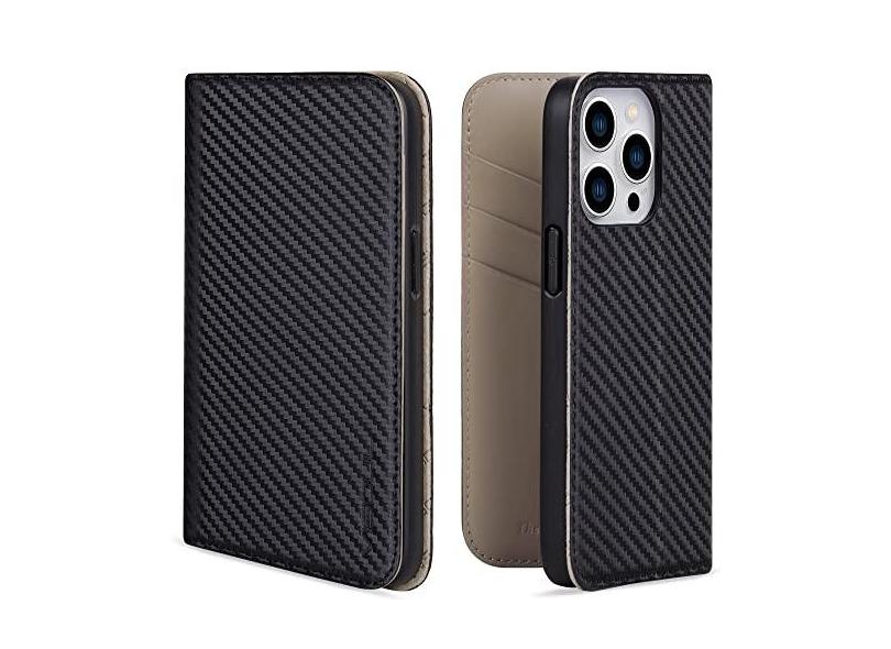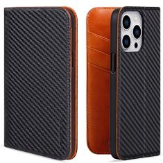 VISOUL Capa carteira para iPhone 14 Pro, capa magnética de couro de fibra de carbono com suporte para cartão para homens e mulheres, capa flip para celular com bloqueio RFID para iPhone 14 Pro (6,1