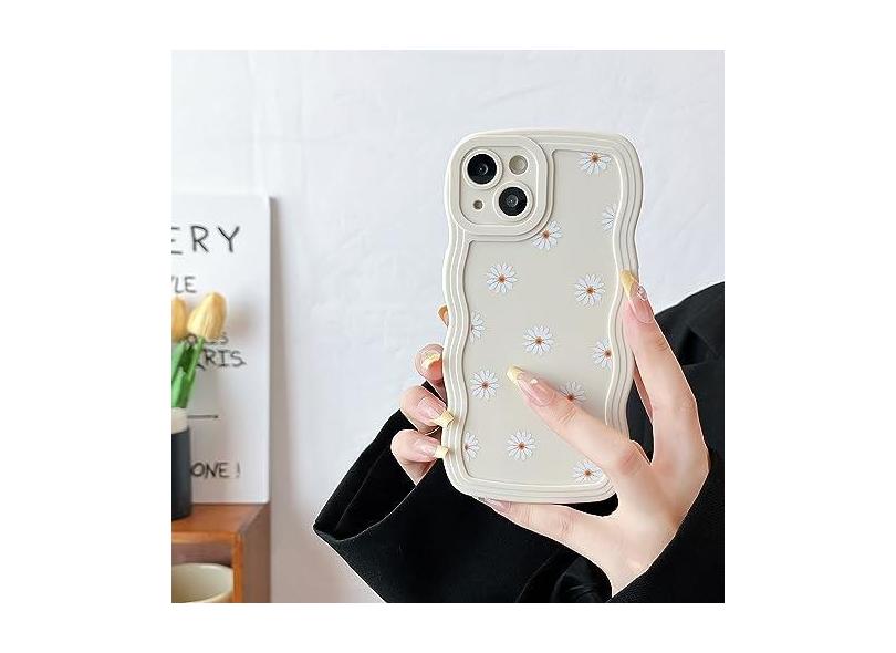 ZTOFERA Capa compatível com iPhone 15, moldura ondulada exclusiva com padrão de margarida, silicone líquido macio, antiimpressões digitais, à prova de choque, cobertura total e capa protetora de lente
