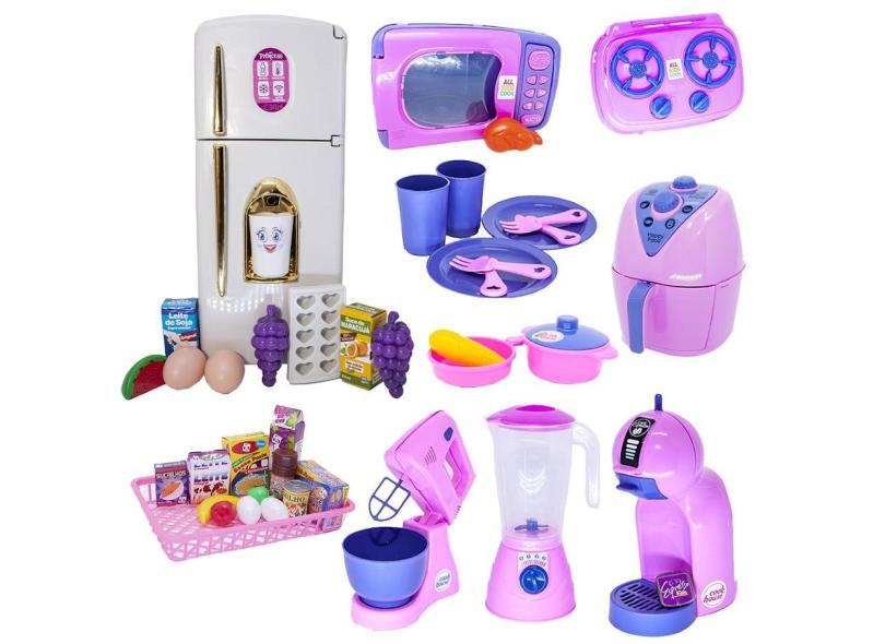 Kit Cozinha Infantil Geladeira Rosa Microondas Louça 43pç