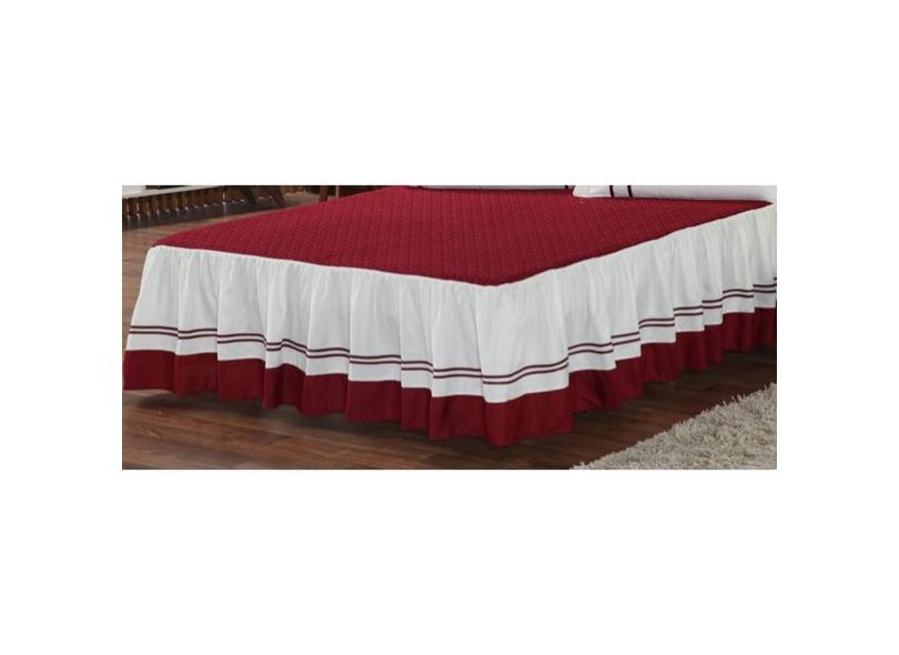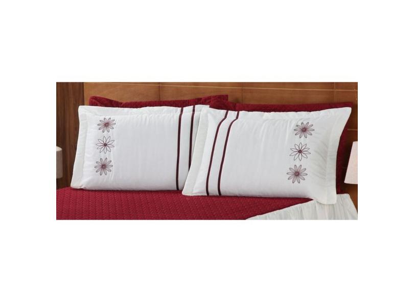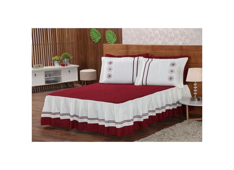 Kit Colcha Casal Cama Box Bordada Flores Renata com Babado 05 Peças BORDÔ VINHO
