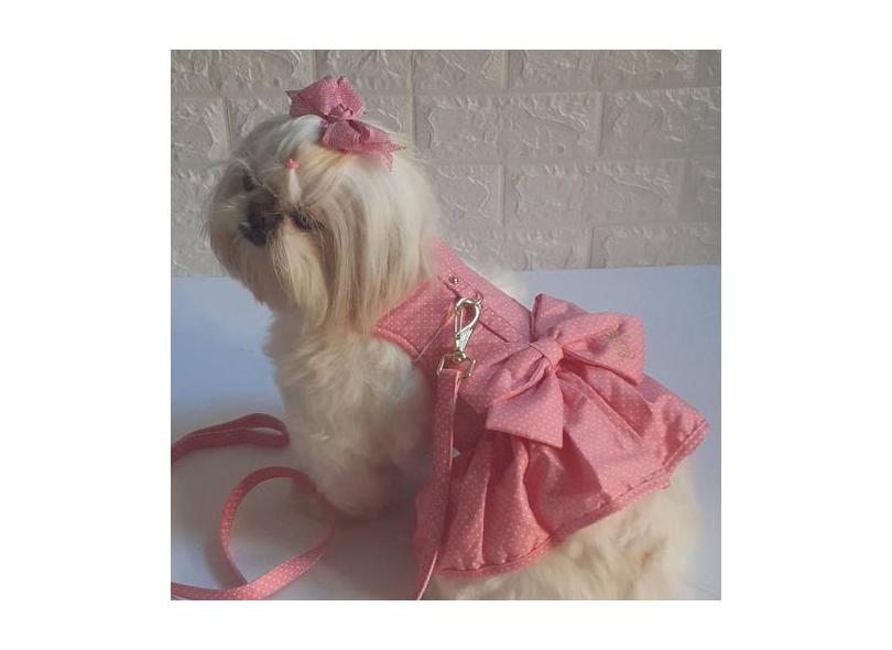 Coleira Para Pet Cachorro Peitoral Vestido Roupa Roupinha E Guia Rosa