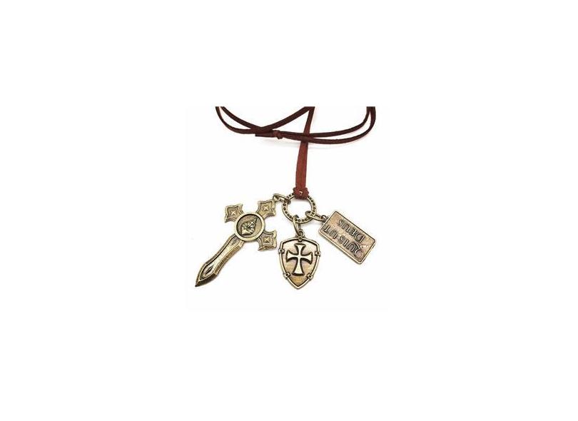 Colar Masculino em Couro Escudo e Espada de São Miguel Arcanjo Ouro Velho