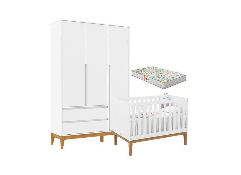 Berço Americano Unique E Guarda Roupa 3 Portas Nature Clean Branco Sof
