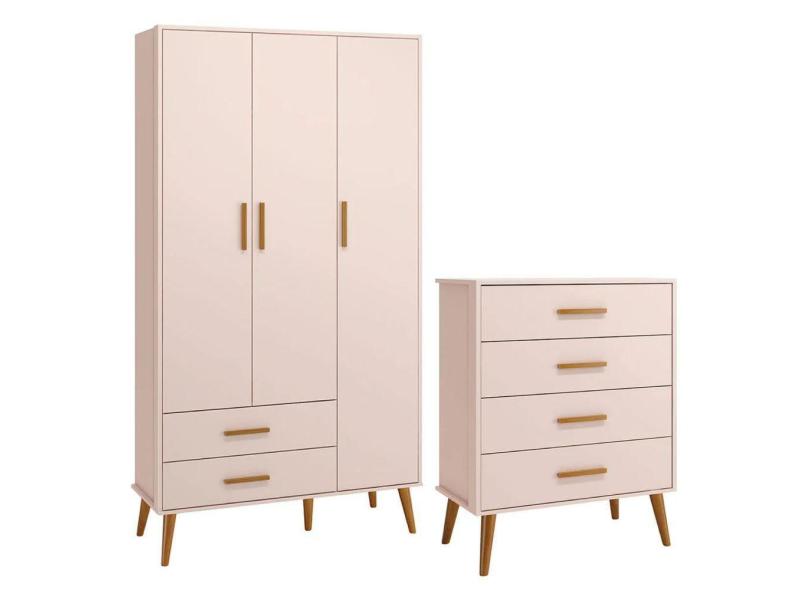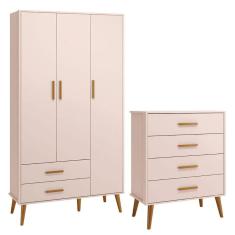 Comoda Gaveteiro e Guarda Roupa Isis Retrô 3 Portas 2 Gavetas Rosa Fosco - Reller