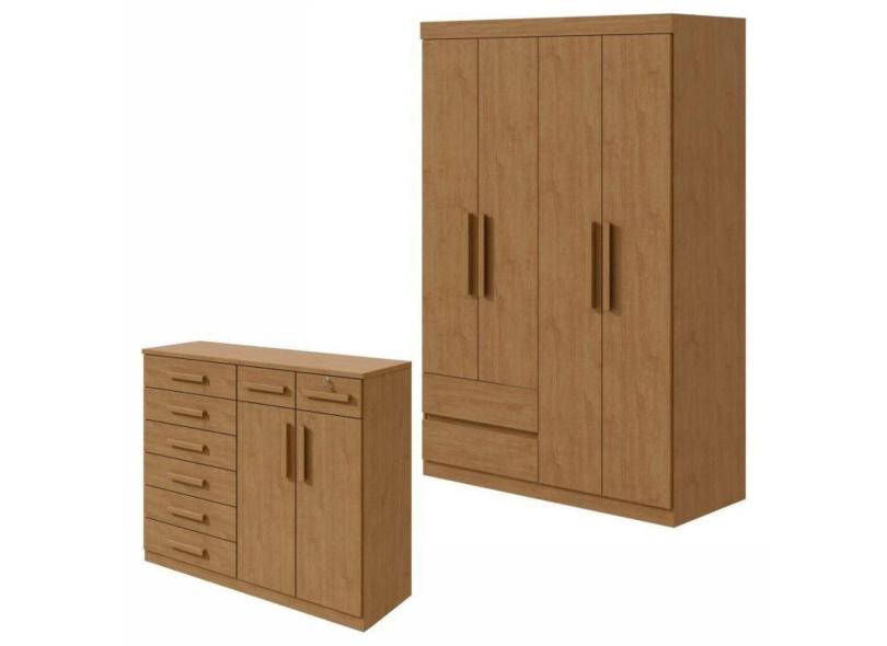 Conjunto de Guarda-Roupa 4 Portas 2 Gavetas Zeus e Cômoda 8 Gavetas 2 Portas Toronto Amêndoa Clean