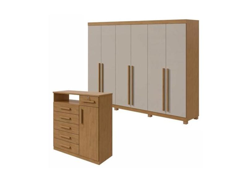 Conjunto de Guarda-roupa 6 Portas com Pés Bertha com Cômoda Da Vinci Amêndoa Clean/off White