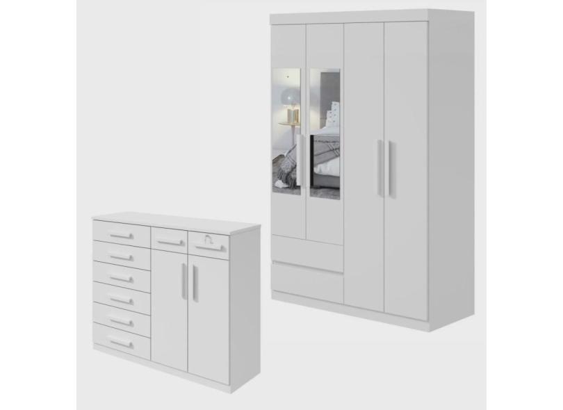 Conjunto de Guarda-Roupa Solteiro com Espelho 4 Portas 2 Gavetas Zeus e Cômoda Toronto Branco