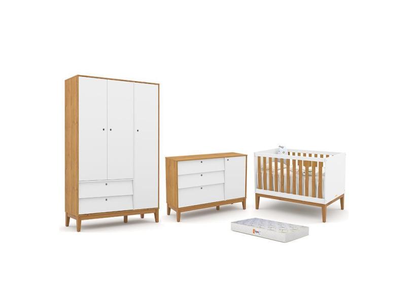 Dormitório Completo Infantil Unique 3 Portas, Cômoda Com Porta, Berço Branco Soft/Freijó/Eco Wood E Colchão - Matic Móveis