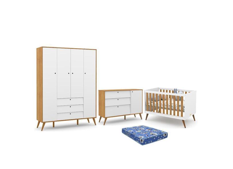Dormitório Infantil Retrô Gold 4 Portas, Cômoda E Berço Branco Soft/Freijó/Eco Wood Com Colchão - Matic Móveis
