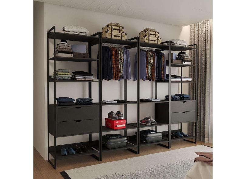 O menor preço encontrado no Brasil para Guarda Roupa Aberto Industrial Casal Modulado Completo Preto Cabideiro com Gavetas Ferro Preto atualmente é R$ 2.391,00.