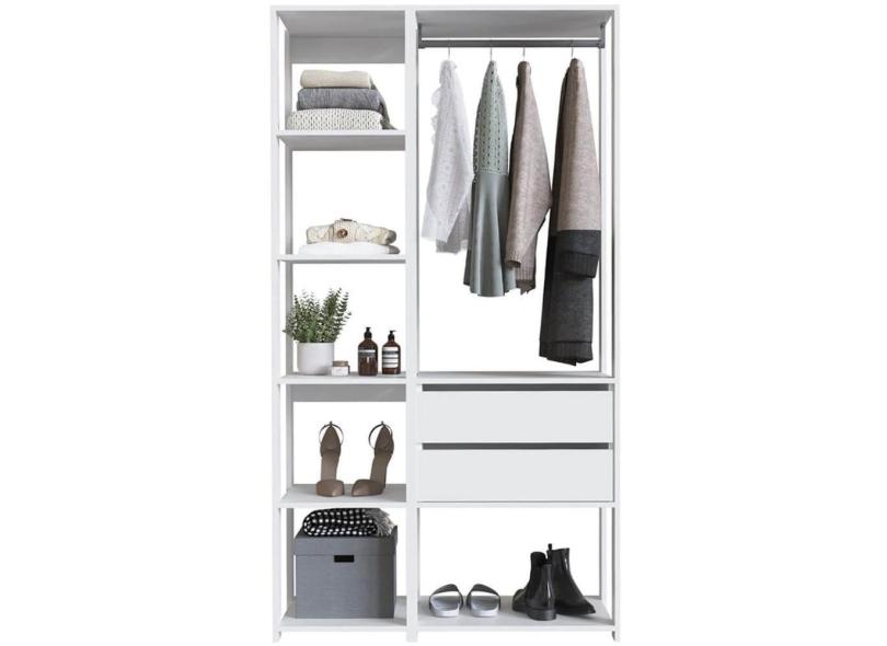 O menor preço encontrado no Brasil para Guarda Roupa Closet 2 Pecas Cabideiro Gaveta Branco Prodecor Com Nichos Modulos Easy Multiuso atualmente é R$ 778,51.