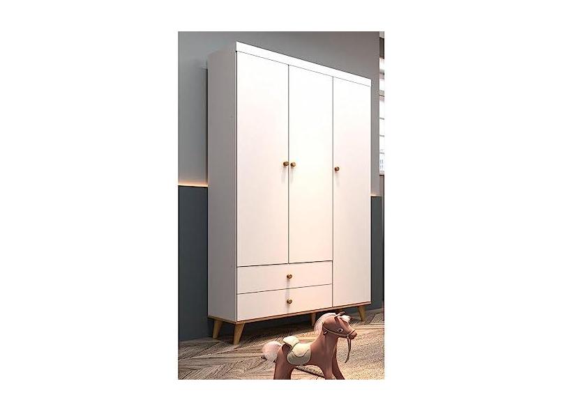 Guarda Roupa Infantil Retrô 3 Portas com Gavetas Lígia Branco Fosco com Bétula Carolina Baby