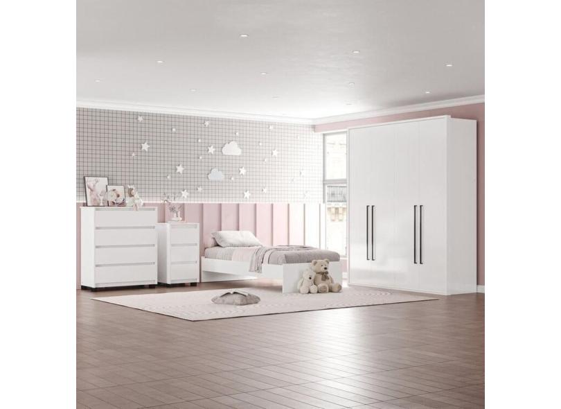 Guarda-Roupa Sevilha 4 Portas Cômoda 4 Gavetas Mesa de Cabeceira 3 Gavetas Cama Infanto Juvenil Branco
