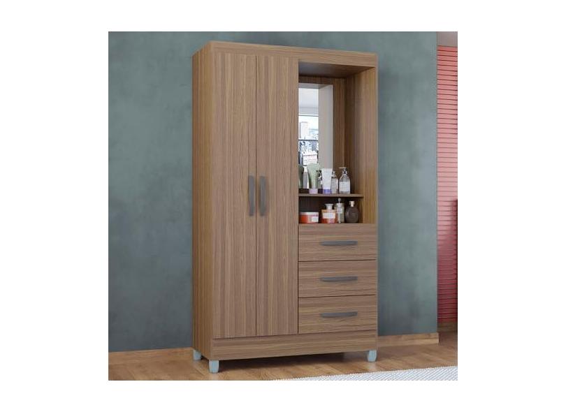 Guarda-Roupa Solteiro Madri 2 Portas 3 Gavetas com Espelho Castanho - Poquema