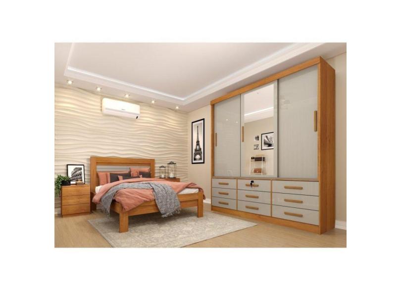 Quarto Completo Guarda Roupa 3 Portas Cama Casal e Mesa de Cabeceira Chicago Tcil Móveis Cinamomo/Off White