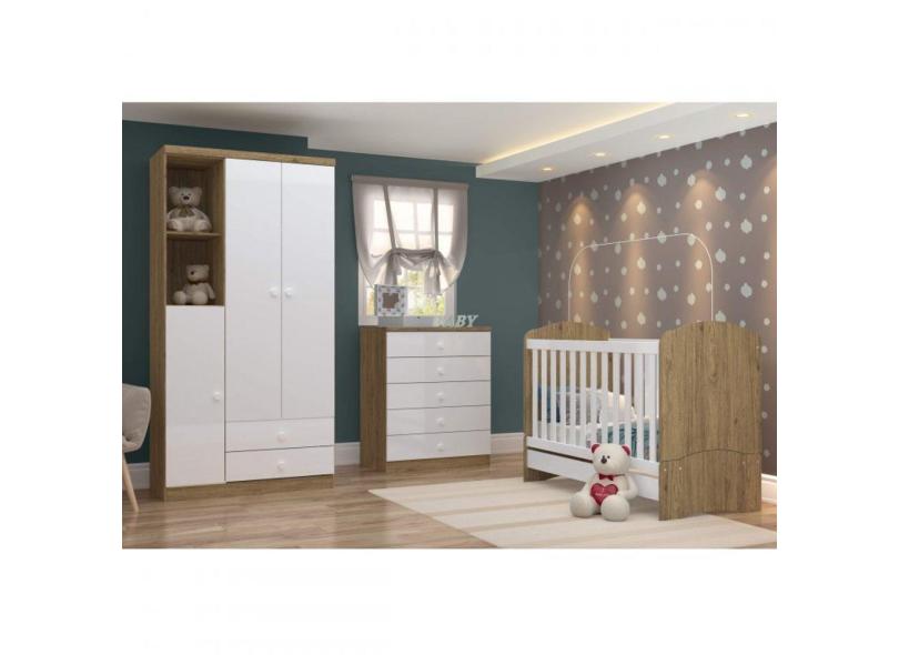 Quarto de Bebê com Guarda-Roupa 3 Portas Cômoda e Berço Faz de Conta Espresso Móveis Rústico/Branco Espresso Móveis