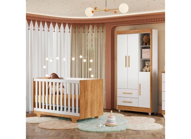 Quarto de Bebê Guarda Roupa 3 Portas e Berço Mini Cama 100% MDF Nina Amadeirado/Branco