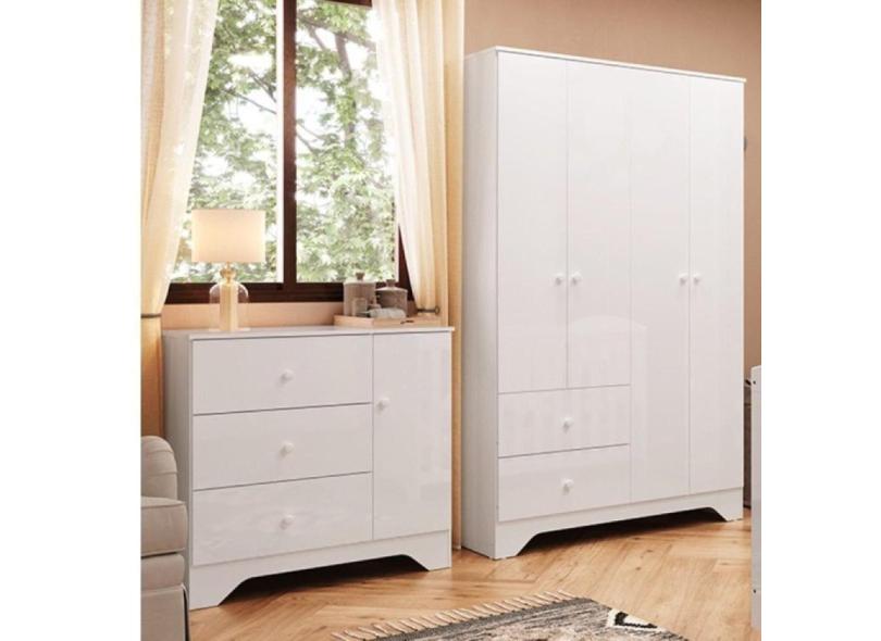 Quarto Infantil Cômoda 1 Porta 3 Gavetas e Guarda Roupa 4 Portas 2 Gavetas 100% MDF Cocada Branco Brilho