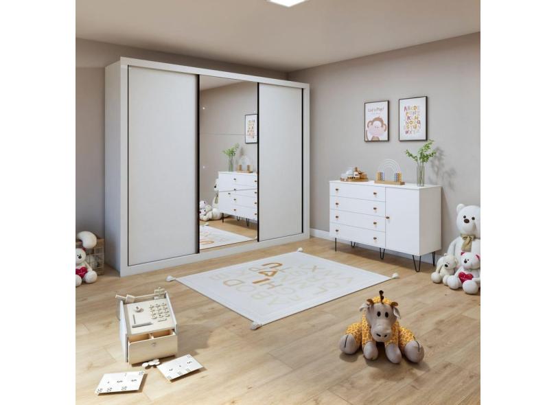 Quarto Infantil Guarda-Roupa com Espelho 3 Portas Marcella com Cômoda 1 Porta 4 Gavetas Aurora Branco