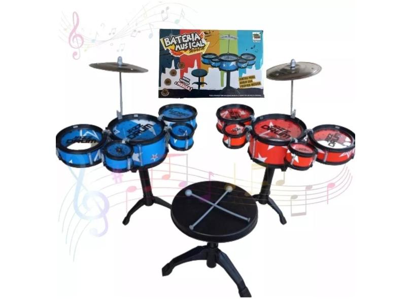 Bateria Musical 5 Tambores Brinquedo Infantil c/ Banquinho e Baquetas