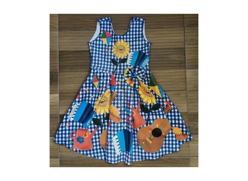 Vestido Infantil De Festa Junina Xadrez Azul Tecido Neoprene Violão E