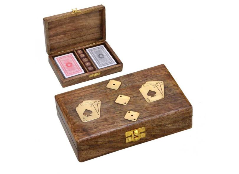 Jogo de Tabuleiro Cartas com Estojo de Madeira e Metal Dourado 18,5cm
