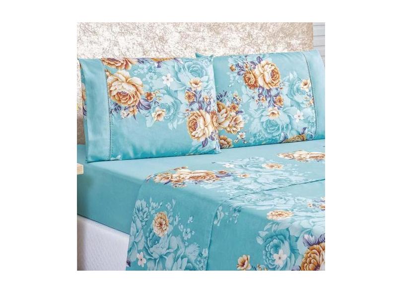 Jogo Cama Lençol Diamond King Tecido Floral ul Turquesa - Casa Scarpa